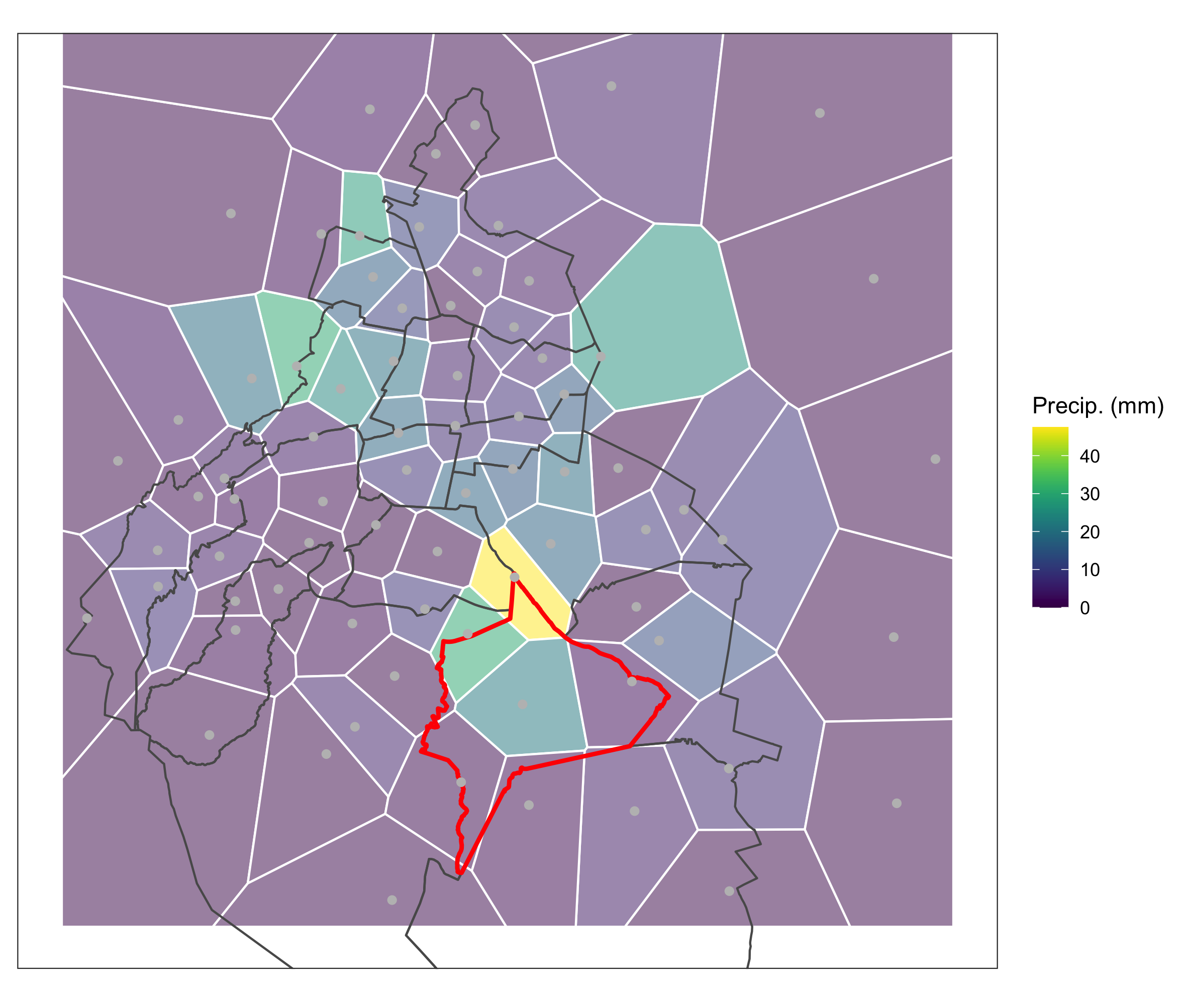 Currently, SACMEX produces a report using two methodologies: (i) ordinary kriging to obtain isohyets and produce rainfall visualizations; (ii) the Thiessen polygon method to obtain the average precipitation (mm) calculated for the entire city and for the municipalities. The use of two methodologies can lead to inconsistencies in the reporting. Moreover, the Thiessen polygon method makes it difficult to automatize the reporting.